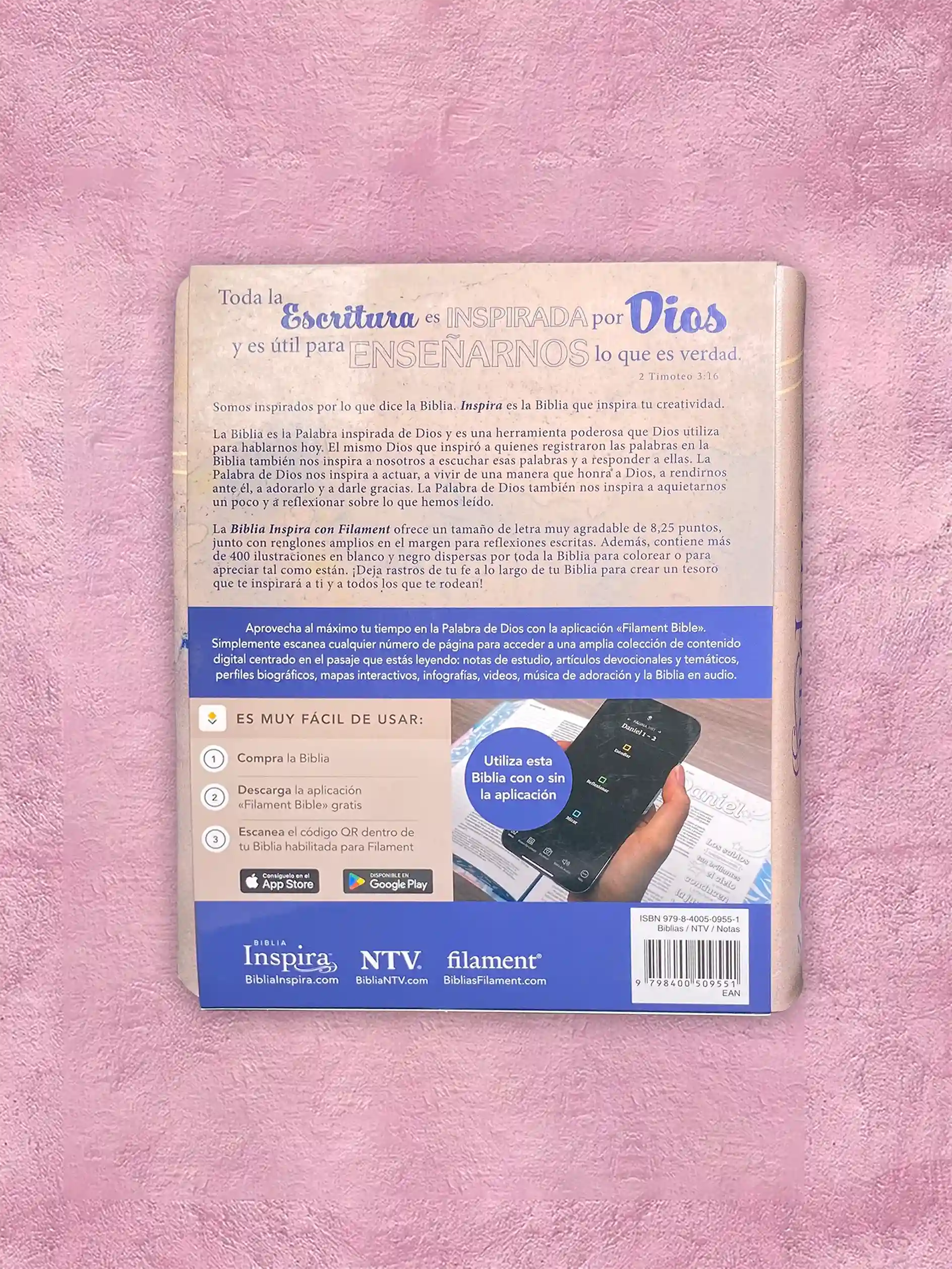 La Biblia Inspira es la Biblia para colorear más vendida del momento, en inglés: Inspire Bible. La naturaleza interactiva de la Biblia Inspira les permite a los lectores conectarse con las Escrituras a través de la expresión creativa.